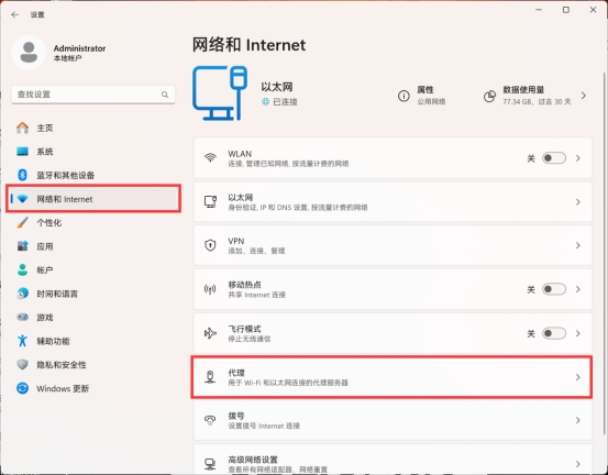 1.进入设置,点击【网络和Internet】,找到右边边的【代理】,点击进入代理设置页面