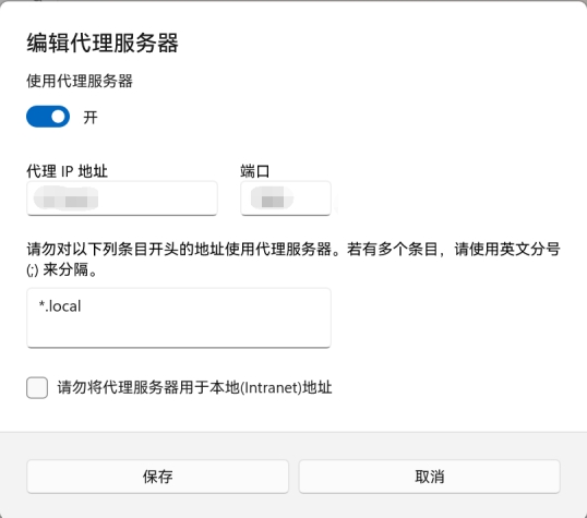 3.打开【使用代理服务器】,将地址填入申请到的代理IP,端口填写申请到的代理IP的端口,点击【保存】即可;